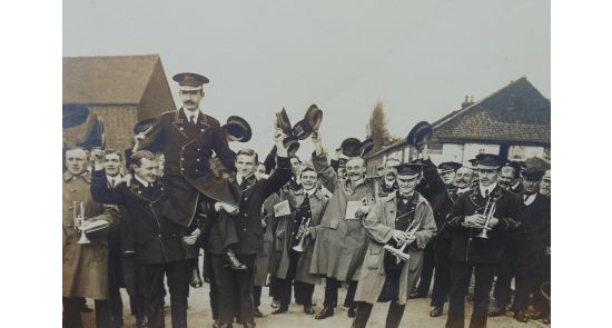 Double Win Celebrations at a concert in Winsford on the 1st Nov 1910 with Ted Wormald and Edwin Firth. The photograph was by taken by Phyllis Hithirington and shows Ted Wormald being lifted aloft with Edwin Firth and Stephen Bartles at the front of the band.
