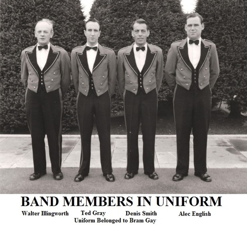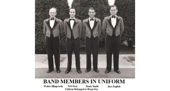 Photograph of Walter Illingworth, Teddy Gray (wearing Bram Gay's uniform), Denis Smith, Alec English